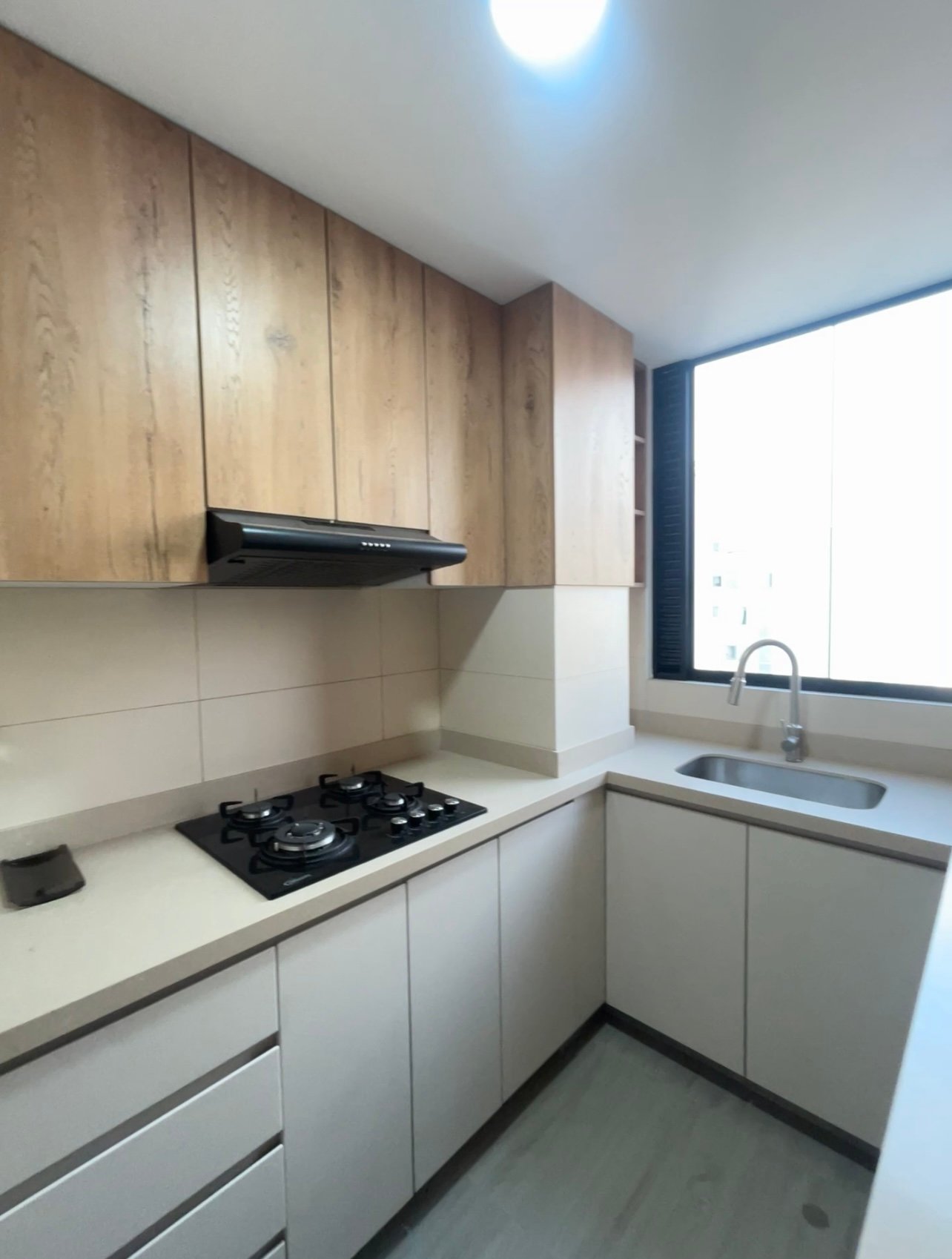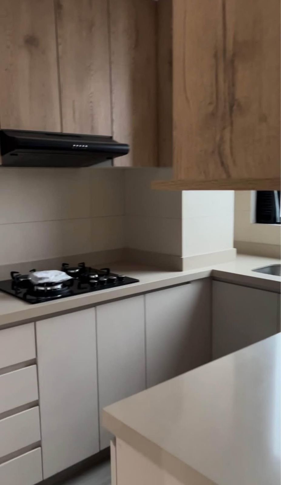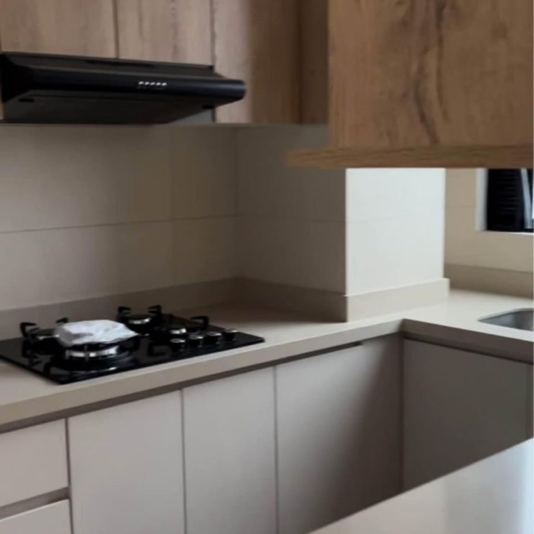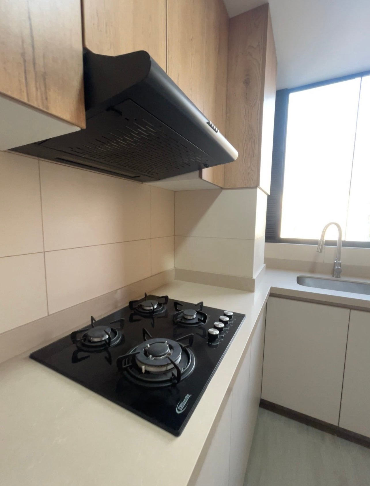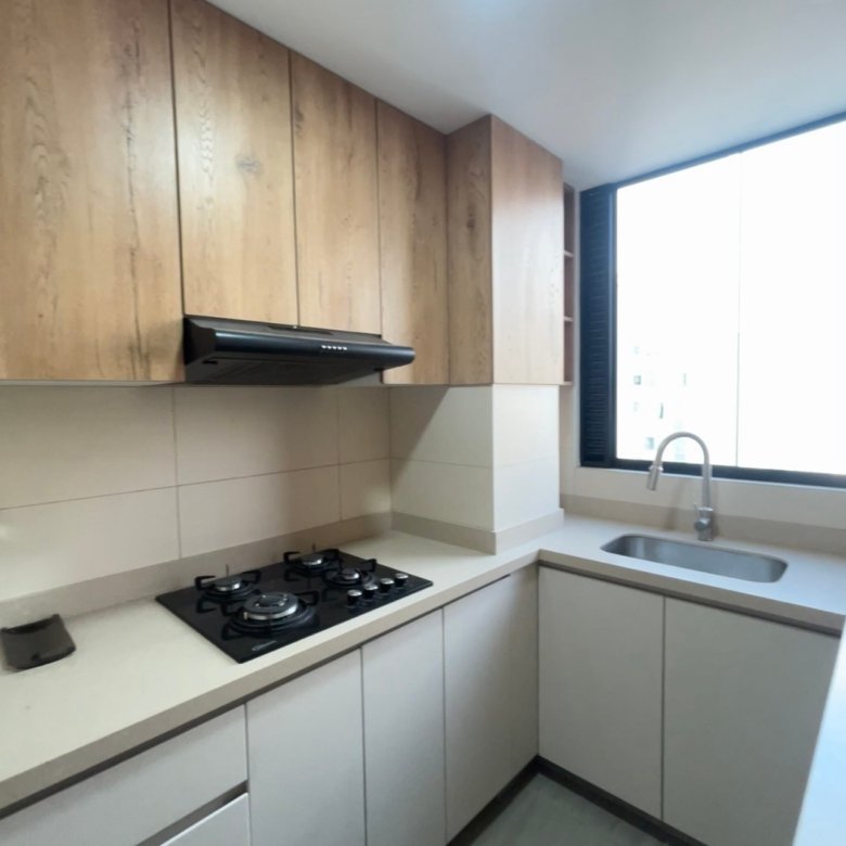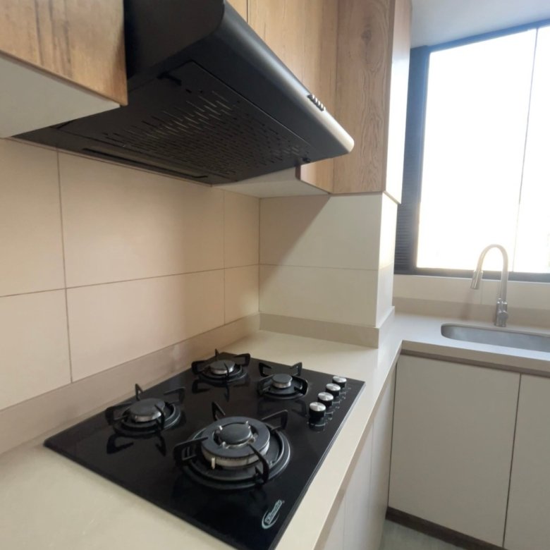 - Cocina equipada con muebles altos y bajos, incluye cocina y campana